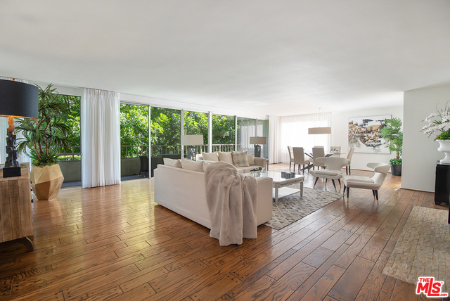 Huge front facing luxurious 2 bedroom, 2.5 bathroom + den in a highly desirable area of Beverly Hills, north of Burton Way. This rare offering is located on a quiet tree-lined street, close to all Beverly Hills has to offer. At 2,784 square feet of living space this unit is spacious and beautiful! Center hall plan. Living/dining room is huge and great for entertaining. Complete with stacked stone fireplace and long balcony looking out to lush greenery. Floor to ceiling windows throughout make for great open light filled spaces. Stunning hardwood floors. Large master suite with dressing area, two tremendous walk-in closets and separate balcony. Sumptuous large paneled den & 2nd bedroom with bath on the other side of the unit. Laundry area in unit. Loads of storage. Lovely pool, spa, social room & secure parking garage with 24 hr attendant.