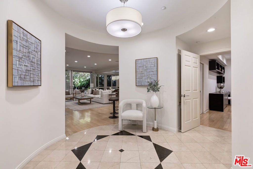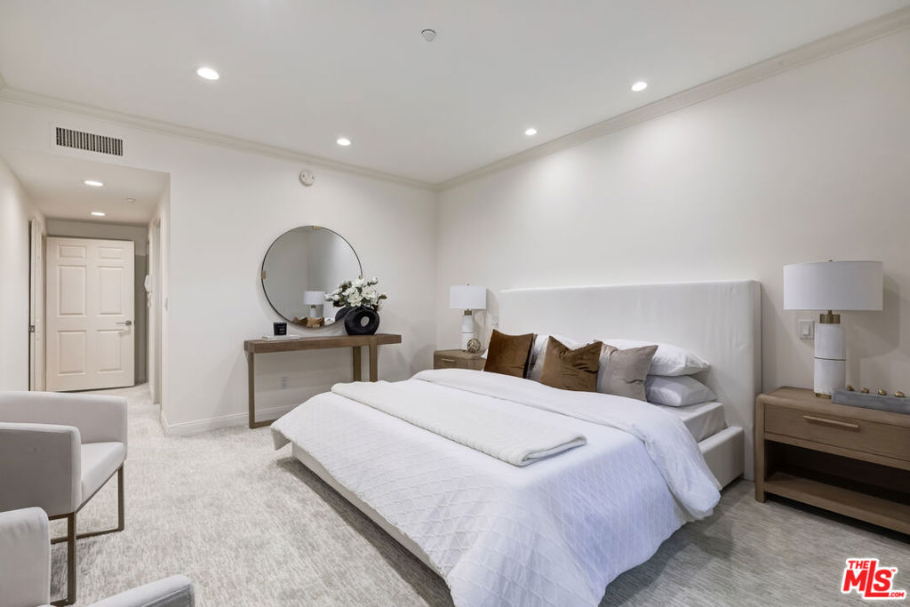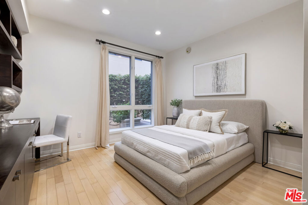 Don't miss this great value! Serene one-story luxury condo in Prime Beverly Hills with RARELY-FOUND, apprx 525 sqft 2-sided garden patios! Ideal for pet owners and those wanting a pretty yard for backyard space. Discover indoor-outdoor living at its best in this pristine 1719 sqft unit at the stately Almont Plaza. Ideally situated on a quiet, tree-lined street just north of Wilshire, this beautifully updated 2-bedroom, 2.5-bath condo feels like a 'private home' complete with lush wraparound garden patios that create a tranquil retreat in the heart of the city. Located in a secure boutique building, this rare corner unit offers complete privacy and a seamless flow for relaxed living and elegant entertaining. The expansive layout features a gracious foyer opening to a large living room with fireplace, custom built-ins, bar and walls of glass doors that bring the gardens in. The oversized formal dining room sets the stage for memorable gatherings. A bright, airy kitchen opens to the patio and is outfitted with top-tier appliances including a Sub-Zero fridge, white cabinetry, a spacious breakfast area, and side-by-side laundry. Designer finishes, wood floors, and oversized windows add sophistication throughout. The generous primary suite boasts a remodeled spa-like bath and an oversized walk-in closet. The second bedroom is equally spacious with a private ensuite bath, plus there's a beautiful powder room for guests. Additional highlights include a full security system, 2-car side-by-side parking in a gated secured garage, and access to luxurious building amenities: a stylish lobby, gym, sundeck, and meeting room. Water and EQ insurance included in HOA dues. Walk to restaurants and enjoy the best of the Beverly Hills lifestyle, renowned shopping, entertainment, Beverly Hills school district, police and fire. Easy to show - This rare garden gem won't last!