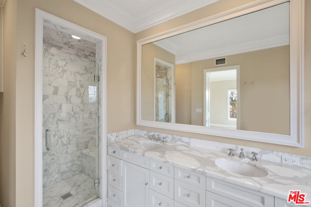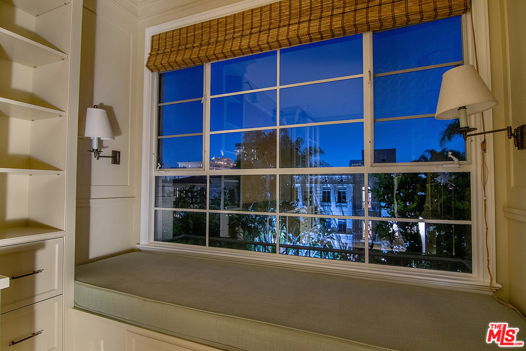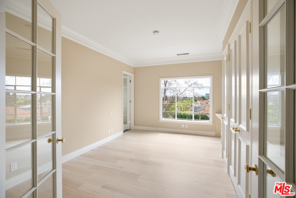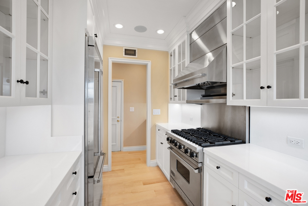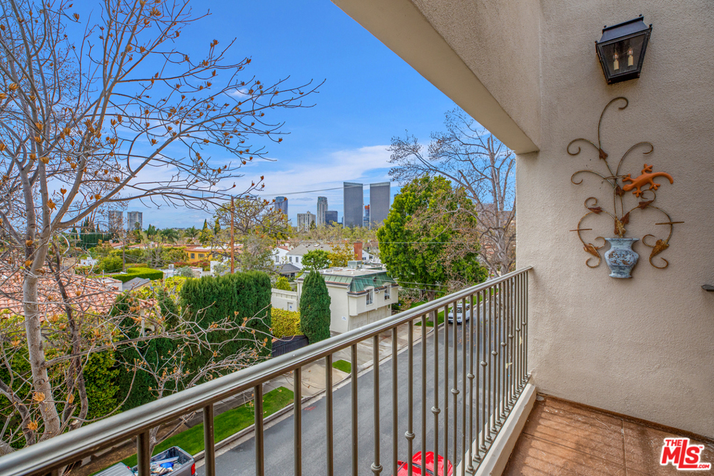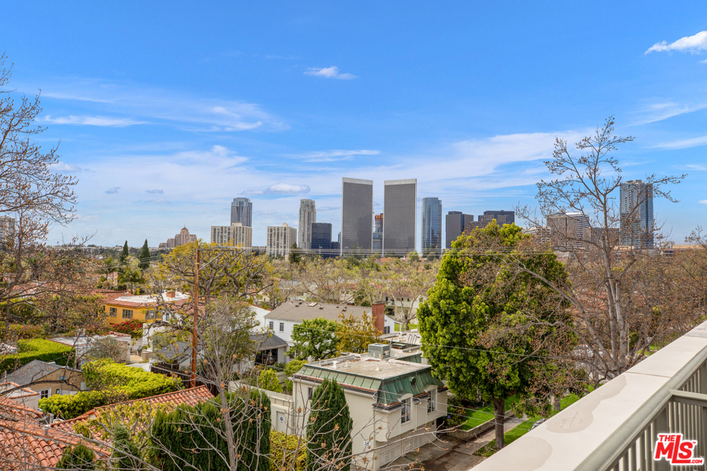 Vintage Manhattan-style remodeled penthouse in Beverly Hills, by renowned architect, Peter Choate, 2 bedrooms,2.5 bathrooms + separate study/den, high ceilings, crown molding, good natural light interior + hardwood floors. Primary bedroom has inbuilt closets +spa-like ensuite Bathroom w/large shower + luxurious tub. Office/study with a bay window daybed + additional storage. Cook's kitchen has white quartz countertops, Viking appliances, custom cabinets with an abundance of storage. Fabulous floorplan with European flair, patio off the kitchen has views of Century City with stairs to an enormous, private terrace with vistas extending from Century City to Downtown providing a perfect setting for alfesco dining. Gated secure garage with security cameras, elevator access. Easily accessible to all the shops, restaurants & Entertainment venues in the heart of Beverly Hills.