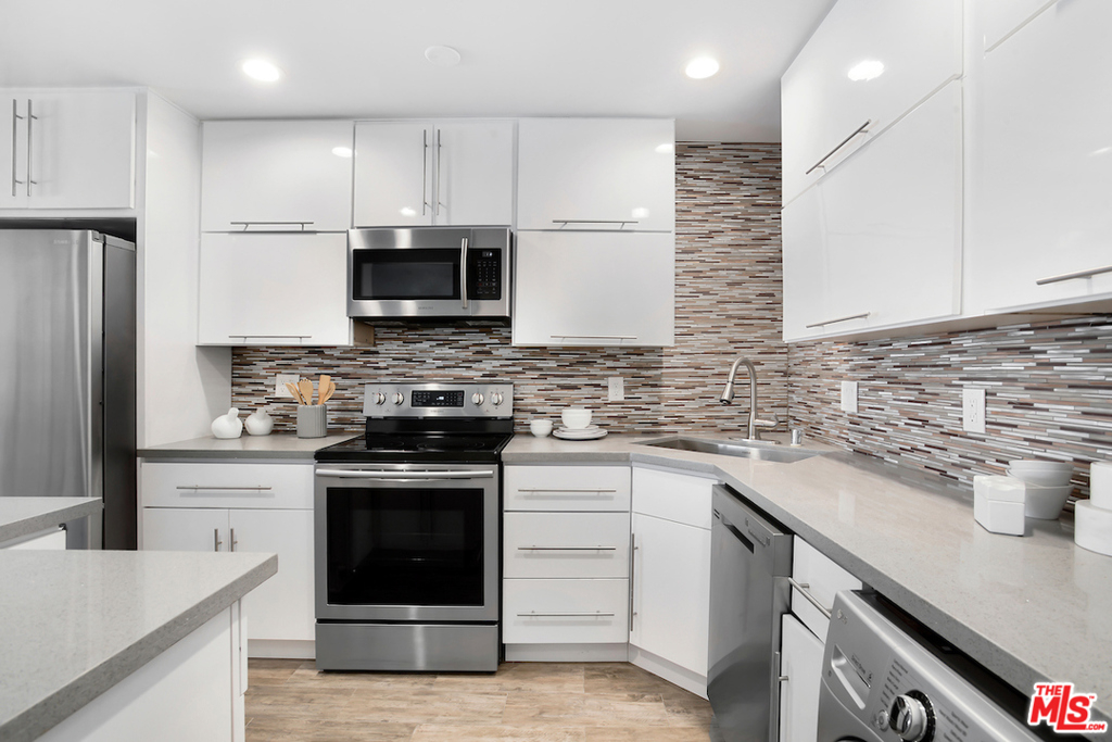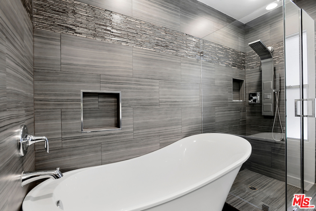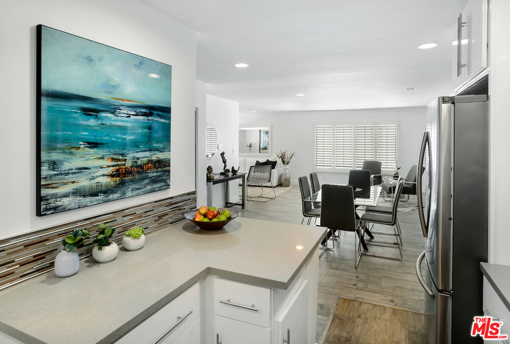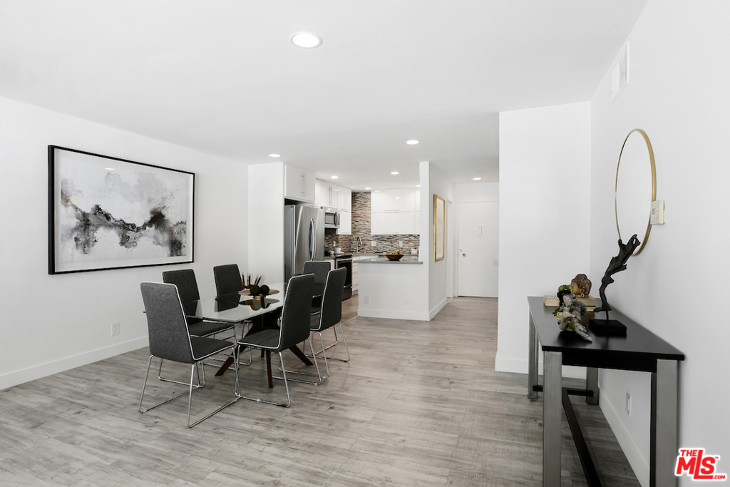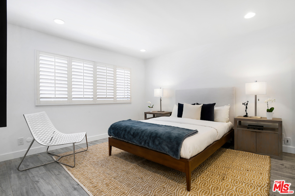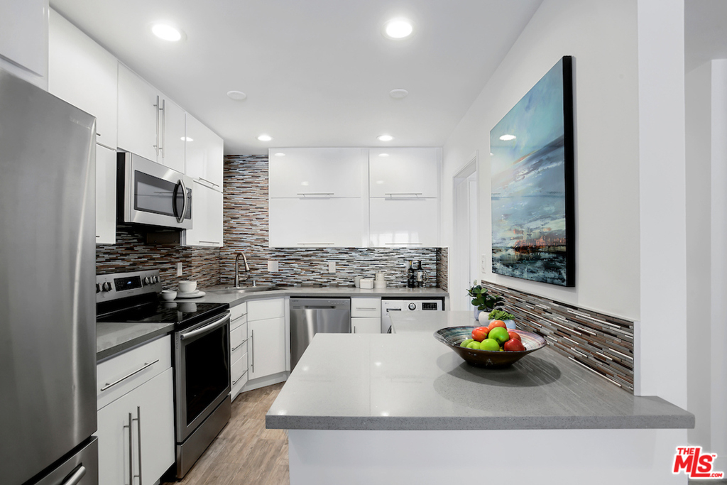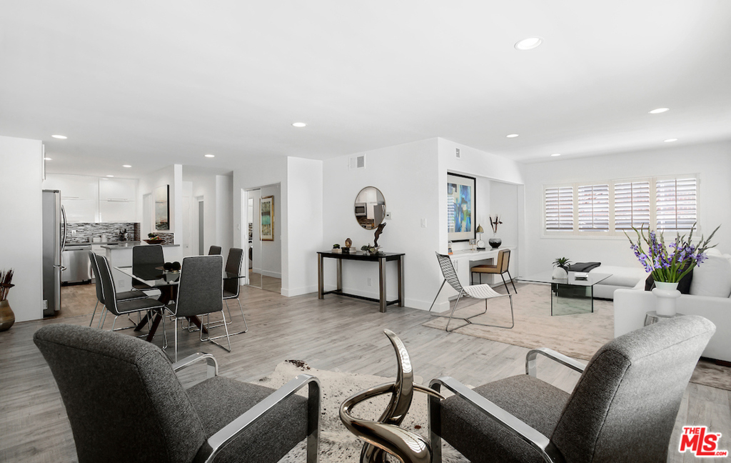 Spectacular- Beverly Hills Penthouse, totally updated one bedroom, one and a half bath with den. Very spacious light and bright unit located on the top floor with great flow, immaculate designer finishes and dramatic details throughout. A pied--terre that is the epitome of chic and sophistication. Gourmet kitchen features, granite countertops, contemporary white custom cabinetry, and a European washer- dryer combo. Enjoy the generous living and dining room, with rich flooring and plantation shutters that leads to an exceptionally large den/ office or convert into a second bedroom. Sensational large prime bedroom suite with gorgeous, renovated bath with dual sinks and rich espresso cabinetry + separate deep soaking tub + separate steam shower. Luxurious full guest bath with pedestal sink cabinet. Smaller, well maintained building with low HOA. Great Beverly Hills location - bring your most discerning buyers. Ready to move in all you need is your toothbrush.