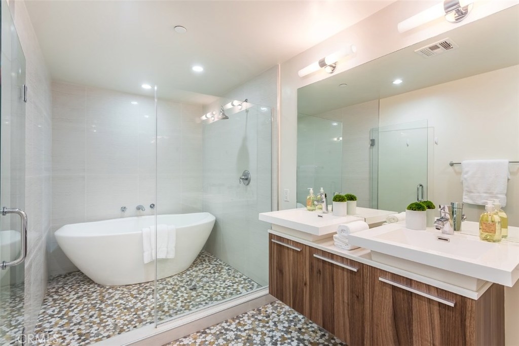 Elegant living at its best. Built in 2011, finished in 2012, this beautifully designed, spacious 2 bedroom, 2.5 bath townhouse (~1,932sf) in Beverly Hills has architectural flair, a light and bright, open floor plan & contemporary design, with high-end fixtures, gleaming hardwood floors, Lutron lighting system, wide-louvered plantation shutters throughout; a perfect place to call home. The large, gourmet kitchen has high-end Bertazzoni professional-grade stainless steel stove/oven and hood, stainless steel Bosch refrigerator and dishwasher, dark-wood custom cabinetry, beveled backsplash and grey marble floors. A half bath on the main level, and two bathrooms on the bedroom level, complete with modern flair. To top it off, take a walk upstairs to your large rooftop deck/patio (~445sf) and take in the colorful views of the city and quintessential California palm tree skyline. The property has a well-run HOA and has much to offer! The building has security-enabled features on all access doors/gates, an onsite fitness center, business center, gated entry and gated subterranean 2 SxS parking, with plenty of guest parking. Relatively low HOA dues cover water, trash, sewer, gardening, and building maintenance. Centrally located and just a hop and a skip to some of the area's best parks, recreational facilities, fine dining restaurants, shopping, and entertainment. Near the new Wilshire Purple Line stop (coming soon)!