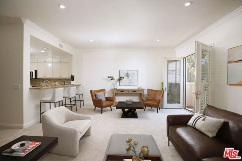 **Price Improvement - Incredible Value**. Modern Beverly Hills living meets timeless Mediterranean elegance in this exquisite condominium located at Beverly Hills Villas. Perfectly positioned just moments from world-renowned Rodeo Drive and adjacent to West Hollywood's vibrant nightlife and Michelin-starred dining, this residence offers a rare opportunity to experience the best of both worlds; Beverly Hills sophistication and West Hollywood energy. This expansive two-bedroom, two-and-a-half-bath residence spans 1,876 square feet and blends classic style with modern functionality. Designed with nine-foot ceilings and an open-concept layout, the home is filled with natural light and features a mix of travertine stone flooring and plush luxury carpeting, which may be converted to hardwood floors if desired. The open layout kitchen showcases granite countertops, a generous center island with room for seating, and an open bar with seating for up to five. Outfitted with stainless-steel appliances, it's ideal for everything from casual breakfasts to pre-dinner gatherings. The kitchen flows seamlessly into the open living and dining areas, which extend to two Juliet balconies with french doors that when open create the perfect ambience for entertaining or unwinding after a day of boutique shopping. The serene primary suite is a private retreat featuring a cozy gas fireplace, custom walk-in closet, and a spa-inspired bathroom finished in natural travertine. The primary ensuite includes dual sinks, a separate makeup vanity, soaking tub, and a walk-in shower. The spacious guest suite offers comfort and privacy, ideal for visiting guests or use as a home office, and also includes its own full travertine bath. Additional features include central heating and air conditioning, an in-unit laundry room with washer and dryer, generous storage throughout, and secure side-by-side parking with steel storage lockers. Residents enjoy secure building access with video intercom, an elevator, handicap-friendly entry, and a shared outdoor sitting area on the first floor. A private park located just north of the complex offers additional outdoor enjoyment. Live just moments from luxury designer boutiques, McLaren and other luxury auto showrooms, world-class medical facilities at Cedars-Sinai, acclaimed cultural venues like the Wallace Annenberg Center and Saban Theatre, and the iconic destinations of Robertson Boulevard and Rodeo Drive. Whether you're entertaining in style or enjoying a quiet night in, this home offers the ideal setting in one of the most coveted neighborhoods in Los Angeles. Don't miss this rare opportunity to own a beautifully appointed primary residence or pied-a-terre in Beverly Hills at exceptional value.
