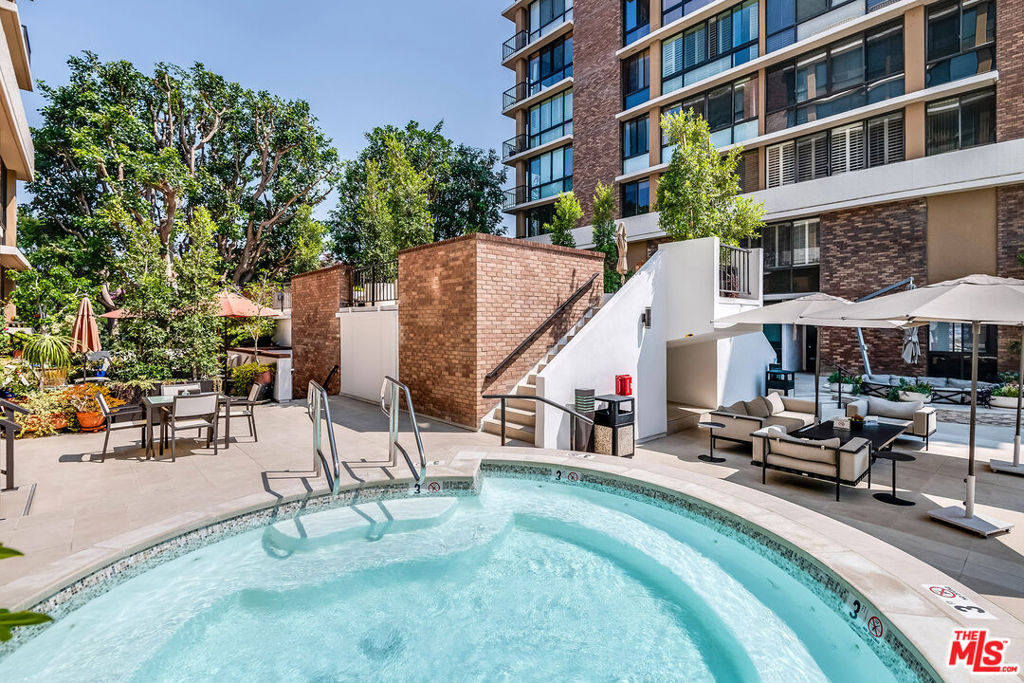 Luxurious living in one of Beverly Hills most exclusive full-service doorman buildings. Residents enjoy full 24/7 security, valet parking, newly redesigned pool and spa area, professional level gym, and top of the line service at their disposal. The beautifully designed, three-bedroom, three-bath townhome offers nearly 2,500 sq ft of elegant living. This corner unit boasts tremendous natural light and features open dining area leading to the gourmet kitchen featuring stainless steel appliances and plenty of cabinetry. Enjoy private garden patio surrounded by lush, mature trees offering a refreshing outdoor retreat. Upstairs find three well-sized bedrooms, including the chic primary bedroom displaying designer walk-in closets and a relaxing ensuite bath showcasing a soaking tub and a glass-enclosed shower. For added convenience, theres also an upper-level laundry room with extra storage. Experience dream living in one of the city's most rare and sought after locations.