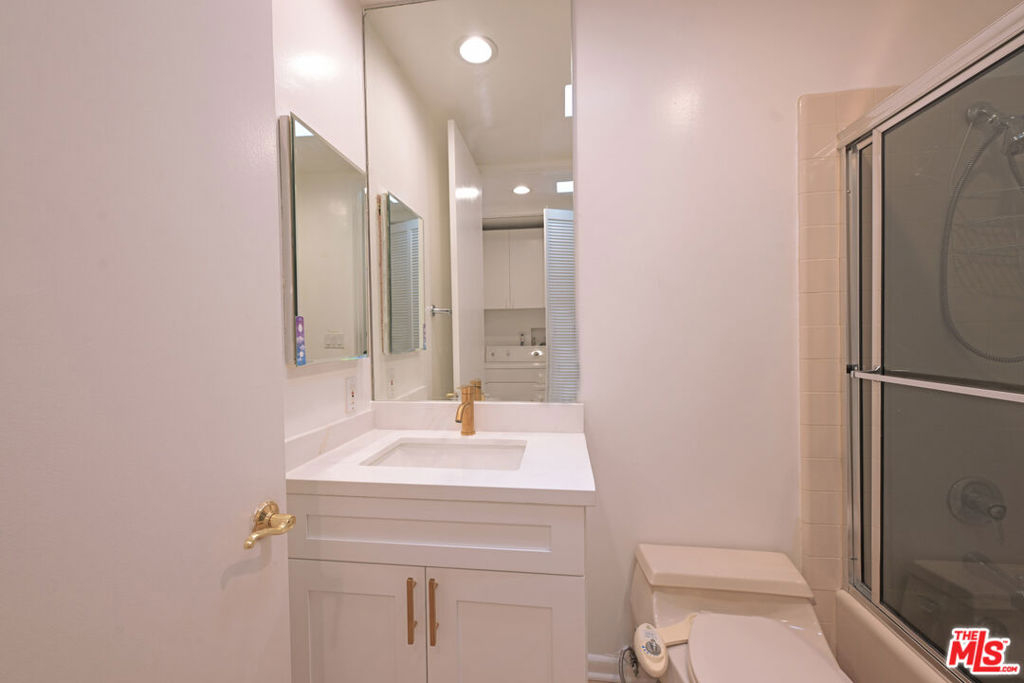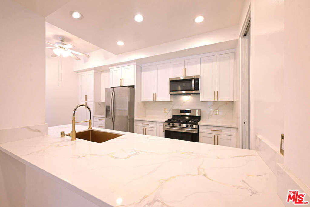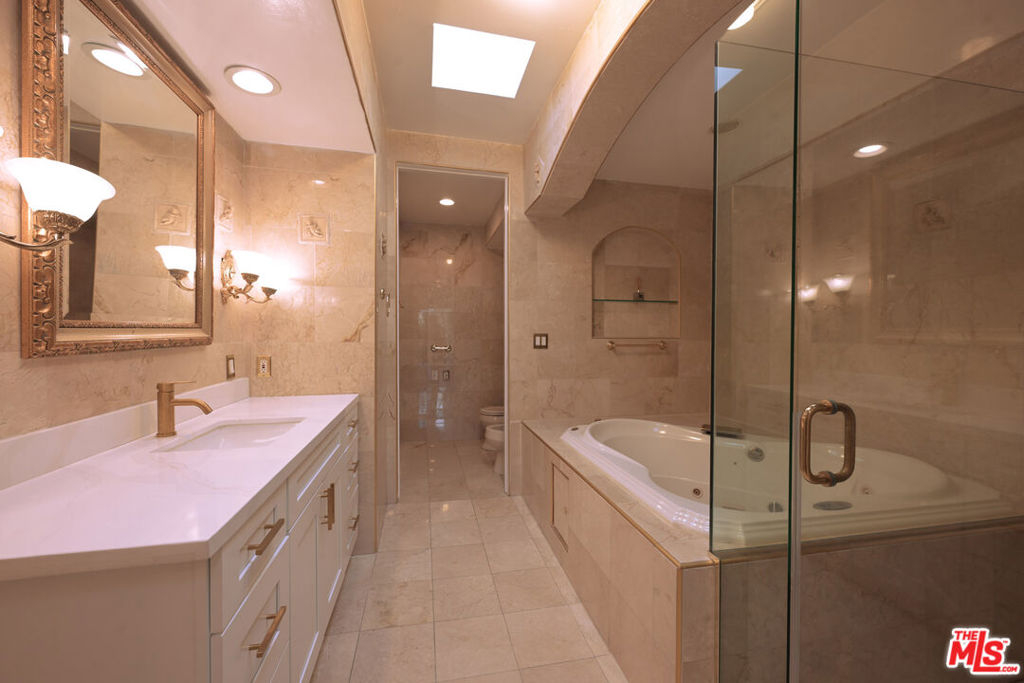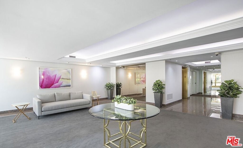 Exquisite Beverly Hills Penthouse with High Ceilings & Sweeping Views . Discover serene luxury in this recently remodeled two-bedroom penthouse in the prestigious "The Hamptons" complex. With a desirable split floor plan, each bedroom is positioned on opposite sides of the unit ideal for privacy each featuring its own en-suite bathroom, plus separate office and powder room w/sky lights. Step inside to soaring ceilings, new flooring, and abundant natural light from skylights and floor-to-ceiling windows that frame gorgeous open views. The spacious living room features a fireplace and opens to a large private terrace perfect for entertaining or relaxing under the stars. The stunning new kitchen boasts quartz countertops, sleek stainless steel appliances, and ample cabinetry. The luxurious primary suite offers downtown city views, a romantic fireplace, a generous walk-in closet, and a spa-like en-suite bath with separate soaking tub and glass-enclosed shower. The second bedroom also includes a walk-in closet and en-suite bath. Additional highlights: Side-by-side in-unit laundry, Two side-by-side parking spots. Resort-style amenities: pool, spa, fitness center, sauna. Unbeatable location near La Cienega Park, Beverly Hills Tennis Courts, The Beverly Center, fine dining, and houses of worship all within the acclaimed Beverly Hills School District. A rare find in one of L.A.'s most coveted addresses!
