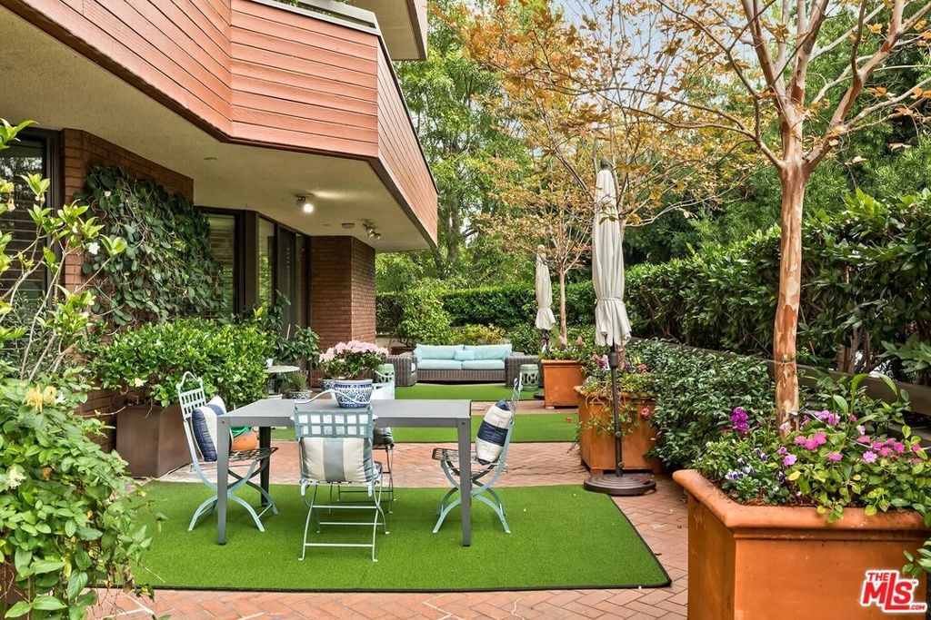 A distinguished and one-of-a-kind residence, this premier corner home is the largest two-bedroom plus den plan at the coveted IV Seasons Condominiums in Beverly Hills. Nestled along a serene, tree-lined street, the residence embodies formal elegance throughout, blending timeless traditional detailing with bespoke craftsmanship and an exceptional indoor-outdoor lifestyle. The grand living room sets the tone with its beautiful fireplace, while the adjacent den features custom library built-ins and rich wood flooring that flows seamlessly throughout the home. Floor-to-ceiling windows invite abundant natural light and frame tranquil treetop views, creating a warm and refined ambiance. This unique floor plan opens to an exceptionally large private courtyard terrace and landscaped potted gardens; an exclusive outdoor sanctuary ideal for entertaining, quiet mornings, or intimate gatherings. Designed for elevated living, the formal dining room provides a classic setting for hosting, while the thoughtfully appointed kitchen and bright breakfast room showcase verdant park vistas. The versatile den transitions effortlessly into a study, library, or media space, enriched by the home's custom millwork and artisanal finishes. The primary suite is a serene, traditional retreat featuring dual custom walk-in closets and a spa-like bathroom with a sunken soaking tub, separate glass-enclosed shower, and refined, timeless detailing. The secondary bedroom suite continues the bespoke aesthetic with its own tailored closet and elegantly appointed bath. An in-unit laundry room adds modern convenience to the home. Residents of IV Seasons enjoy premier full-service amenities, including 24/7 doormen, valet parking, a newly renovated entry foyer, upgraded corridors, a community courtyard pool and spa, a fitness center, and dedicated storage. Just moments from the finest shopping, dining, and cultural experiences in Beverly Hills and across the Westside, this exceptional residence offers a rare blend of privacy, sophistication, and enduring elegance.