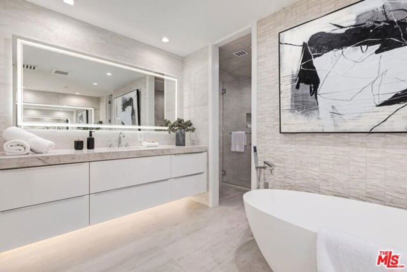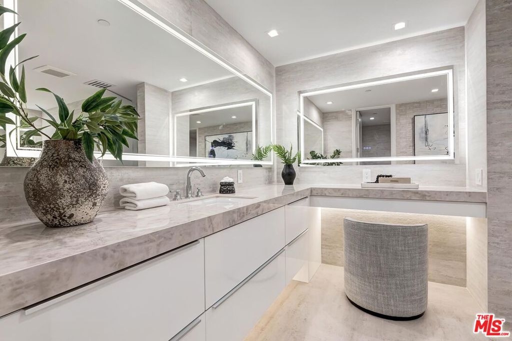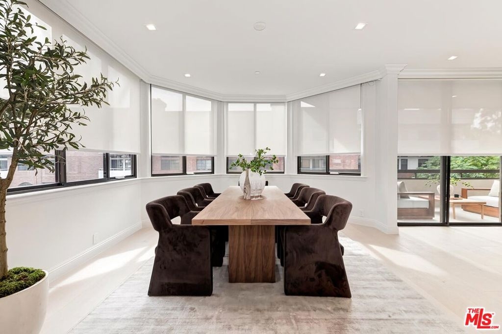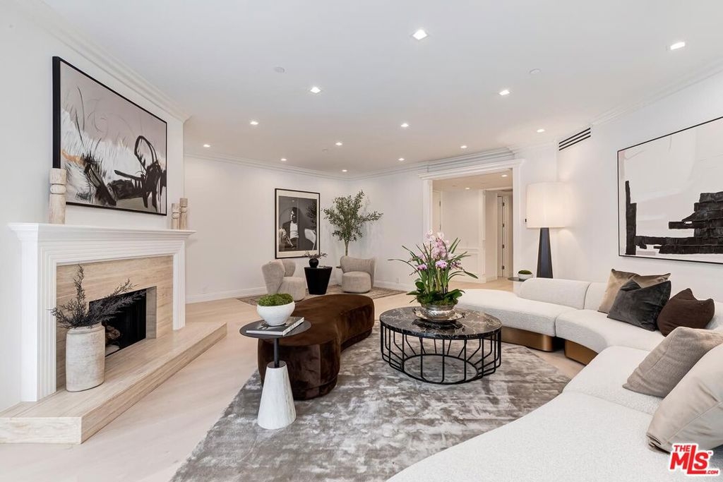 An elegant sanctuary in the heart of Beverly Hills, this sleek, modern, and timeless residence designed and completely renovated new by a notable European design team offers the rare feeling of living within your own secure, private enclave just moments from the city's most celebrated destinations. Thoughtfully curated and impeccably executed, every detail reflects refined elegance, from wide-plank white oak flooring throughout to custom built-ins, streamlined new appliances, and bespoke walk-in closets with tailored cabinetry. Stunning and private, this sun-drenched, south-facing two-bedroom residence with a flexible den ideal as a home office, media or viewing room, or convertible third guest space is located in one of Beverly Hills' most coveted full-service buildings. Set on a serene, tree-lined street just steps from Cedars-Sinai, the Beverly Hills, and the boutiques and restaurants on Robertson Blvd, the home enjoys a highly desirable south-facing floor plan, generous street setback, and exceptional natural light throughout. The beautifully designed interiors are defined by floor-to-ceiling windows, modern energy-efficient recessed lighting, elegant crown moldings, and custom wainscoting, creating a refined yet welcoming ambiance. Designed for effortless entertaining, the residence features a gracious living room with fireplace opening to a private terrace, a formal dining room, and a spacious den with wet bar suited for entertaining, relaxing, or working from home. The bright, elegant gourmet kitchen is both functional and visually striking, appointed with porcelain countertops, top-of-the-line appliances, custom cabinetry accented by dramatic under-counter lighting, and a sunlit breakfast area overlooking lush greenery. The expansive primary suite is a true retreat, offering custom walk-in closets and a luxurious spa-inspired bath with dual vanities, separate water closets, a soaking tub, and an oversized walk-in shower delivering a five-star hotel experience in the comfort of home. The second bedroom features a custom closet and a beautifully finished en-suite bath, while a dedicated laundry room with built-in cabinetry completes the residence. The IV Seasons North complex has recently undergone thoughtful updates to its lobby, corridors & elevators and is renowned for its exceptional full-service lifestyle. Amenities include 24-hour doormen, valet and concierge services for residents and guests, a heated pool and spa, a fully equipped fitness center, secured parking, and additional storage. Moments from Rodeo Drive, the Beverly Hills Hotel, world-class dining, shopping, and cultural landmarks and with easy access to West Hollywood and the Farmers Market this exceptional residence presents a rare opportunity to enjoy an elevated, turnkey in-town pied-a-terre defined by timeless design, premier services, and the unmistakable sophistication of Beverly Hills.
