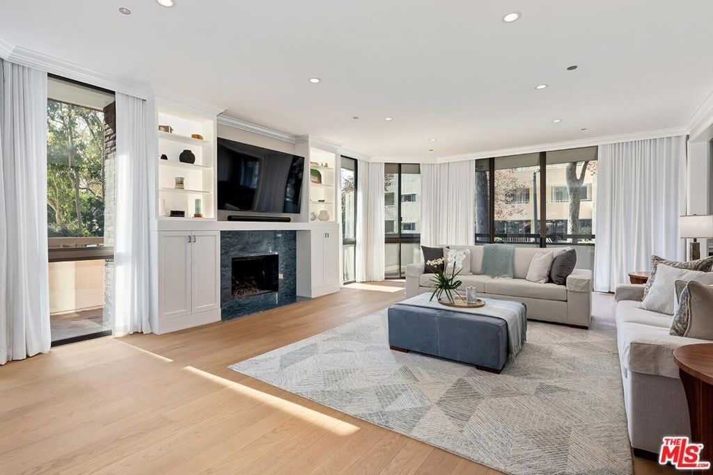 Second floor front south west facing unit with large wrap-around patio, Unit 102. Experience the epitome of luxury living in this meticulously renovated coveted front corner unit on the second level at the full-service IV Seasons condominiums. This 2 Bed 3 Bath with Den and large wrap-around patio with garden views is a masterpiece of design. The unit is flooded with natural light and is adorned with the finest quality finishes, reflecting the sellers' original intention to create and make this their own personal Beverly Hills residence. All renovations were completed in 2024. From the European prime grade oak flooring to the all-new custom cabinetry seamlessly integrated throughout, you are offered the best of functionality and style. Some other features include high ceilings, a formal entry, quartz countertops, Ann Sacks tiles, custom closets, built-ins, wet bar in den, and designer wallpaper adds a touch of artistic flair, while a newly crafted granite fireplace with bespoke built-ins serves as a stunning focal point in the living area. Every detail has been thoughtfully curated, including custom lighting that enhances the ambiance of each room. The IV Seasons is known for its 24/7 full-time doorman, valet parking for residence and guests, a heated pool and spa, and gym. The condo also includes storage. This residence promises an exclusive lifestyle on a beautiful tree-lined street in one of the most coveted neighborhoods and luxury full-service buildings in Beverly Hills.
