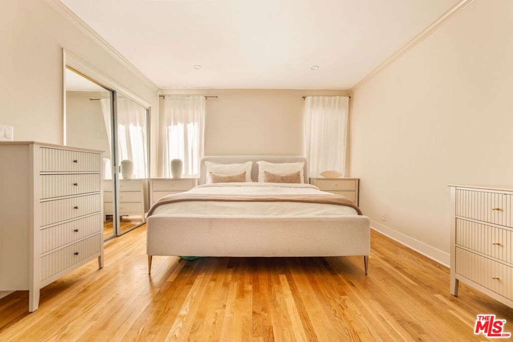 Tucked away on one of the most desirable tree-lined streets in Beverly Hills, just north of Burton, this beautifully updated two-story townhouse-style residence offers an exceptional blend of space, style, and location. Situated within an intimate six-unit building in one of the city's most sought-after residential pockets, the home delivers the privacy and comfort of townhouse living while being moments from the world-class lifestyle that makes Beverly Hills so desirable. This light-filled residence features an ideal two-level floor plan with generous living spaces and thoughtful upgrades throughout. The upper level welcomes you with a spacious living room and formal dining area, perfect for both relaxed living and entertaining. Large windows fill the space with beautiful natural light, while the private balcony offers a refreshing breeze and a peaceful setting overlooking the charming neighborhood.The well-appointed kitchen features granite countertops, stainless steel appliances, and abundant cabinetry, complemented by a convenient laundry room with a walk-in pantry. Two bedrooms are located on the upper level, including a generously sized primary suite designed for comfort and tranquility.The lower level offers incredible versatility, featuring an additional bedroom and bathroom along with an expansive family room or den. While the home is officially configured as a three-bedroom residence, the spacious bonus room has been thoughtfully converted into a separate bedroom, allowing the property to function comfortably as a four-bedroom home, ideal for guests, a home office, or flexible living arrangements. Additional highlights include gleaming hardwood floors, newly refreshed interior paint, elegant crown molding, recessed lighting, stylish light fixtures, mirrored wardrobes, and three beautifully remodeled bathrooms.Located in a quiet, well-maintained building with low HOA dues, the home also includes secure garage parking with two-car tandem spaces. Residents benefit from access to the highly acclaimed Beverly Hills Unified School District, adding further value to this exceptional offering. Moments from the renowned shopping, dining, and entertainment of Rodeo Drive and the vibrant lifestyle of Beverly Drive, this residence presents a rare opportunity to enjoy sophisticated living in the heart of Beverly Hills.