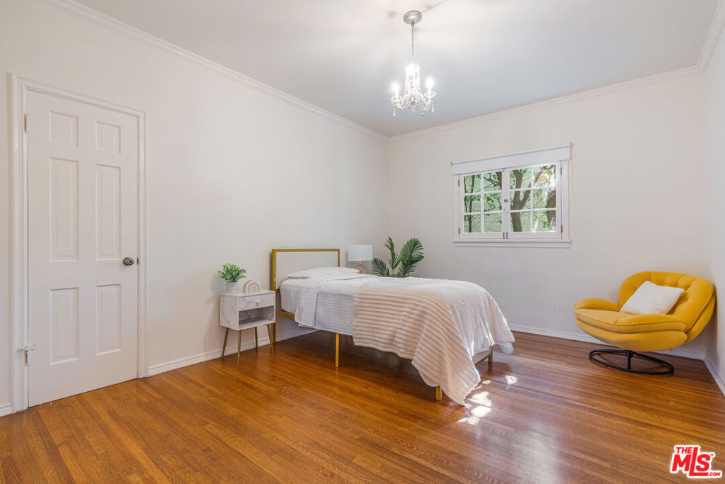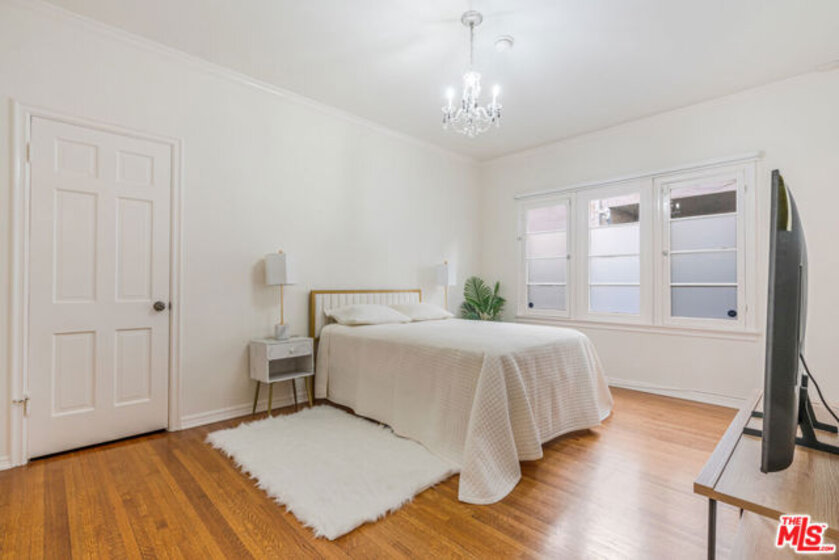 A refined expression of Classical Revival style architecture, this Beverly Hills residence reflects a thoughtful reinterpretation of classic European design. Framed by mature cypress and defined by a symmetrical stucco facade, wrought-iron detailing, and a formal recessed entry, the home presents a composed and enduring architectural presence. Inside, approximately 1,210 square feet of living space is defined by warmth, proportion, and understated elegance. Sunlit interiors feature rich hardwood floors, crown moldings, paneled walls, and graceful ceiling details, creating rooms that feel intimate yet refined. Large windows introduce soft natural light, reinforcing a sense of calm and balance throughout. The home offers two bedrooms and two bathrooms, ideally suited for a sophisticated primary residence, an elegant pied-a-terre, or a discerning downsizing opportunity. A charming kitchen blends classic cabinetry with modern functionality, complementing the home's architectural character while supporting everyday living. Centrally located yet inwardly serene, the interiors offer a quiet retreat from the surrounding energy. Set within a highly walkable Beverly Hills neighborhood near shops, cafes, and restaurants, the residence pairs architectural distinction with the ease of an urban lifestyle, appealing to those who value timeless design, location, and discretion.