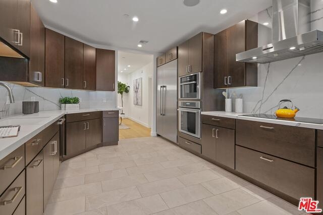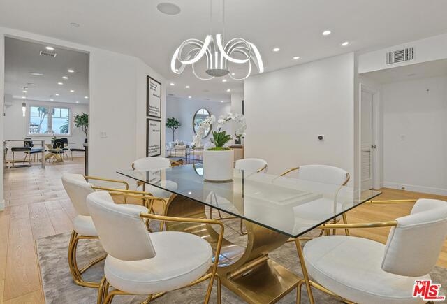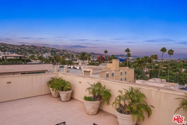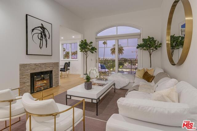 An elegantly remodeled (2018) and sophisticated penthouse in prime Beverly Hills 90210, with views of the city to the Hollywood Hills. Beautifully appointed wide oak-plank flooring, spacious open living and dining areas with high ceilings (raised 13" in remodel) that lead to a private balcony, and a gourmet chef's kitchen replete with gorgeous white marble countertops, backsplash, built-in breakfast bar, and top-of-the-line appliances. A luxurious owner's suite features a gorgeous ensuite bath with dual vanity sink, spa-like tub, walk-in shower, and refined basketweave white marble flooring. Complex has an oversized rooftop patio with 360 degree views, fitness center, meeting rooms, guest parking, gated access and security guard/doorman during daytime hours.