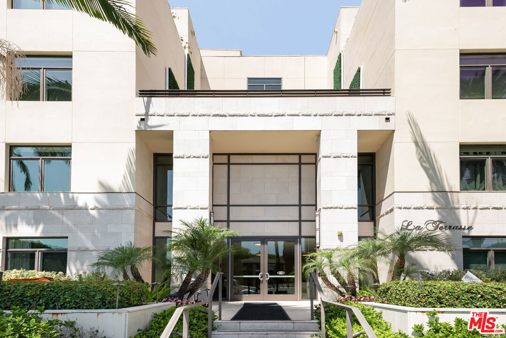 Front-facing 2-bedroom, 2.5-bath residence in the full-service La Terrasse condominium building in Beverly Hills. This luxury condo features brushed walnut and limestone flooring, a floor-to-ceiling limestone fireplace, solid-core mahogany doors, and high-gloss Italian burled walnut and sycamore cabinetry. The kitchen offers polished marble and granite countertops along with top-of-the-line appliances.The spacious primary suite includes a spa-style bathroom with separate soaking tub and shower. Multiple walk-in and built-in closets provide ample storage. In-unit washer and dryer included.Unit includes three side-by-side parking spaces and two large private storage units. La Terrasse amenities include concierge/guard service, secure gated parking, reception lobby, media room, fitness center, club terrace, and a fourth-floor sun terrace with city views. Conveniently located in Beverly Hills and near the Sunset Strip, the Golden Triangle, Bristol Farms, Melrose Place, and Robertson Boulevard shopping and dining.